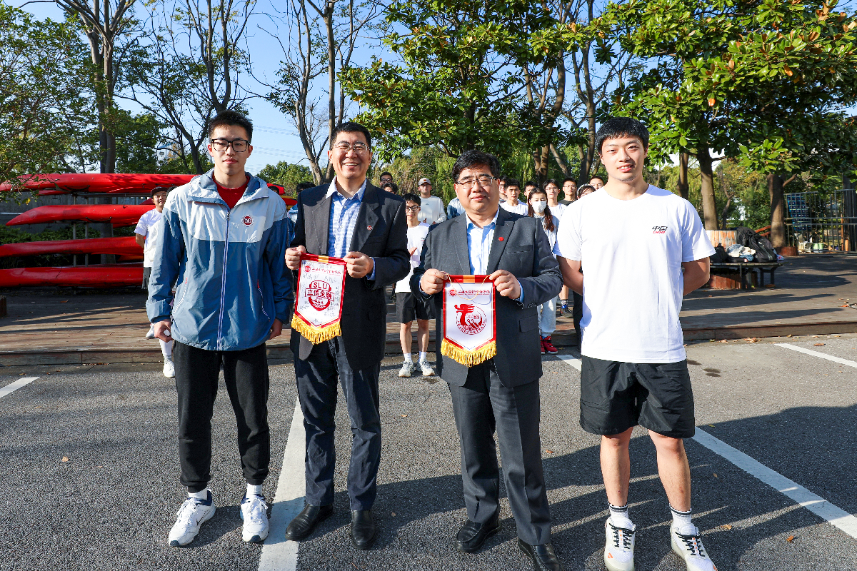 校领导向赛艇队、龙舟队、花剑队代表赠送队服并合影留念,高水平运动队代表向校领导赠送队旗。