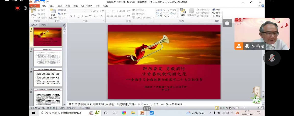 为引导青年学生进一步坚定理想信念,工商管理学院青年马克思主义研究会举办学习贯彻党的二十大精神主题座谈会。学院党委书记吴明华主持座谈会,杨浦区金色夕阳老干部正能量工作室理事长李自力老师做主题发言,100多名师生在线上参加了活动。