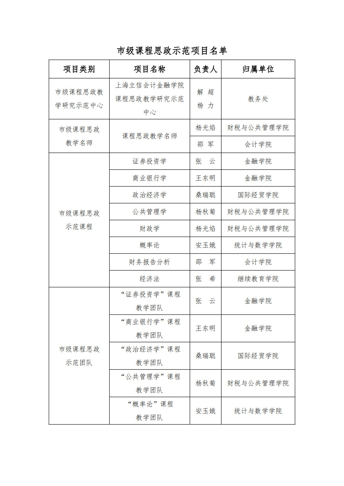 近日,上海市教委公布了市级课程思政示范项目名单,我校课程思政教学研究中心获批市级课程思政教学研究示范中心,财税与公共管理学院杨光焰教授、会计学院邵军教授获评为市级课程思政教学名师,《财政学》等八门课程获批市级课程思政示范课程,“证券投资学”课程教学团队等五个团队获批市级课程思政示范团队。