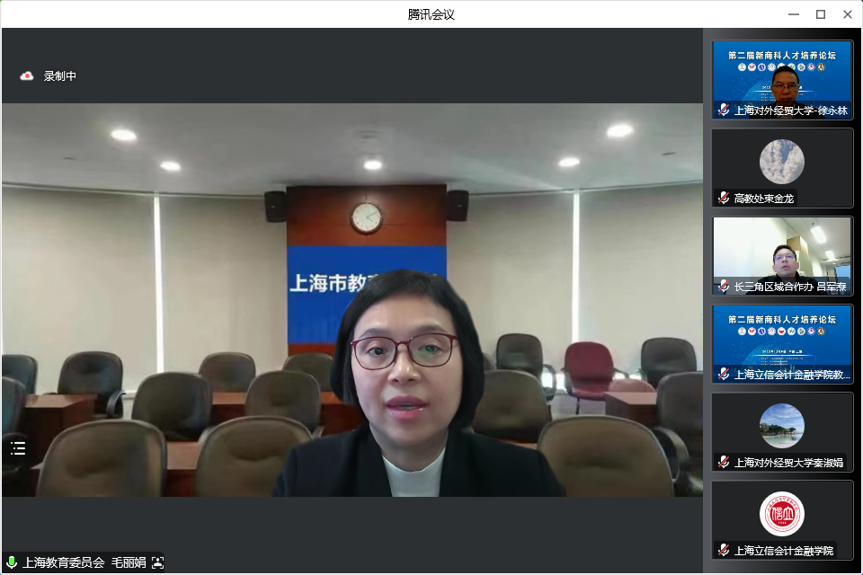 毛丽娟代表上海市教育委员会对长三角新商科教育联盟的成立和第二届新商科人才培养论坛的举办表示祝贺。她表示,上海始终将教育放在优先发展、重点发展的突出位置,着力打造与一线城市相匹配的一流教育,积极服务经济社会发展大局。联盟的成立和论坛的召开是对新时代商科教育需求的回应,带动商科教育资源共建共享、商科教育改革融合创新、商科创新型人才协同培养;希望联盟成员们在新商科人才培养的道路上各美其美、美美与共,为长三角地区新商科教育协同发展、高质量发展做出新的贡献。