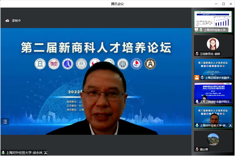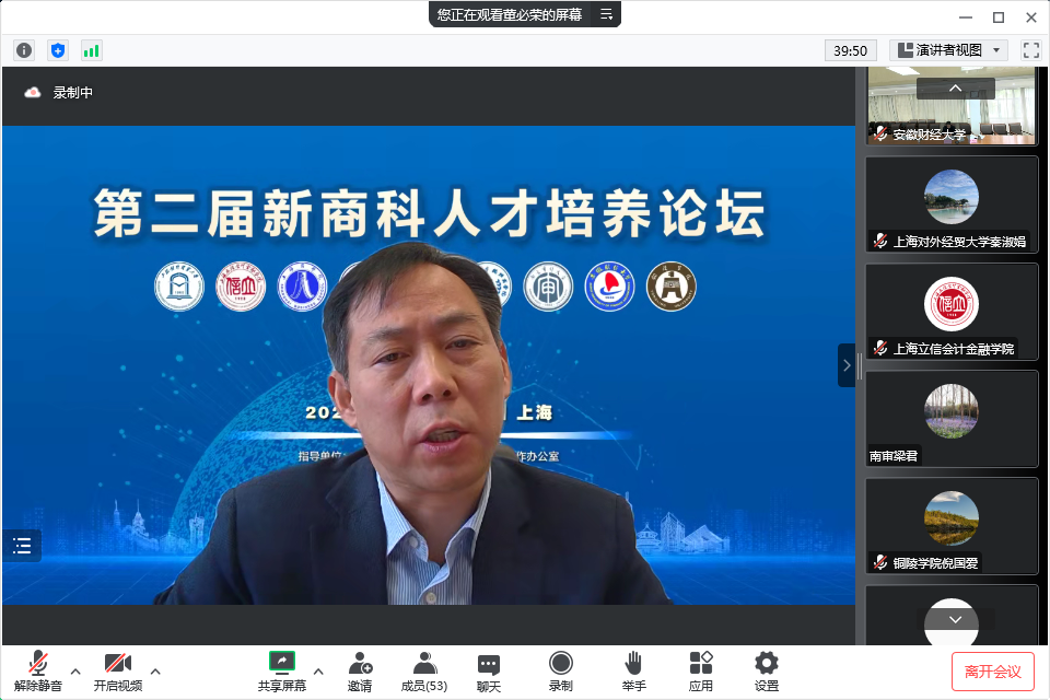 杨力表示新商科联盟在有组织的科研、人才培养、专业建设和服务区域高质量发展等方面有着广阔的合作空间,欢迎联盟高校积极参与“中国知识体系研究中心”“上海市长三角科创产业金融服务协同创新中心”等特色平台建设,共同打造教育部“金融学专业虚拟教研室”等优质教学资源。