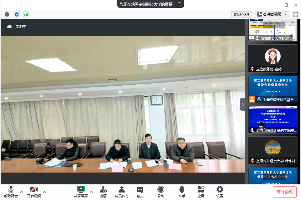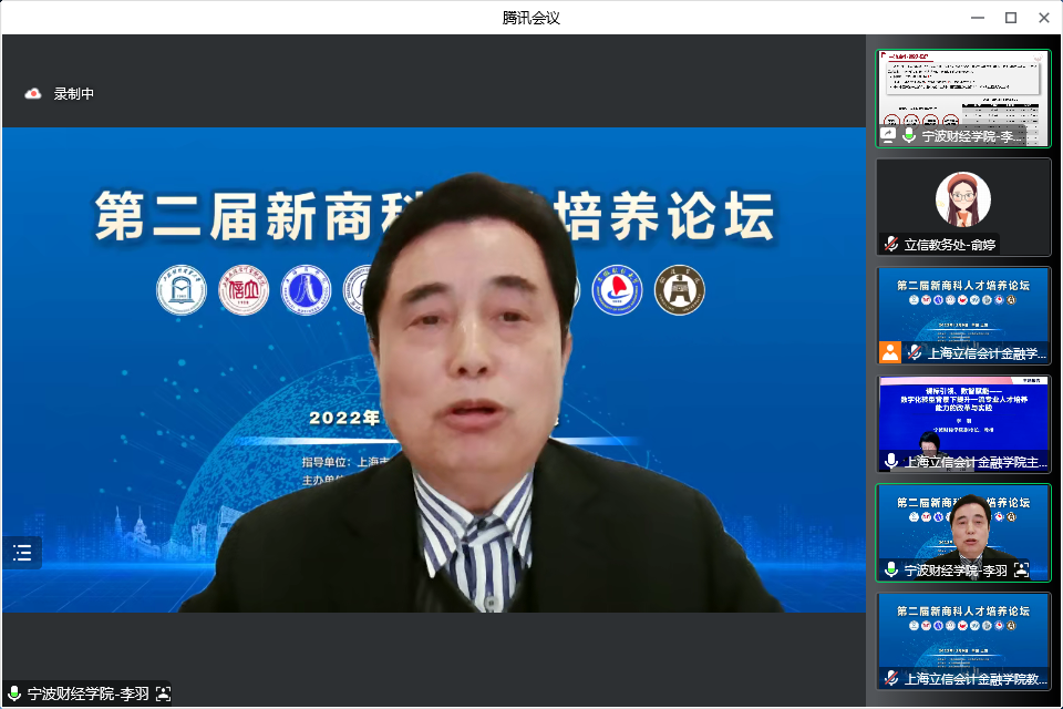 本届论坛聚焦“新文科背景下财经类一流专业建设”主题,以线上线下相结合的形式,来自长三角地区高校的400余位专家、学者出席。南京审计大学校长董必荣教授,上海对外经贸大学副校长徐永林教授,安徽财经大学副校长周加来教授,宁波财经学院副院长李羽教授及我校党委副书记、院长杨力教授作主题报告。