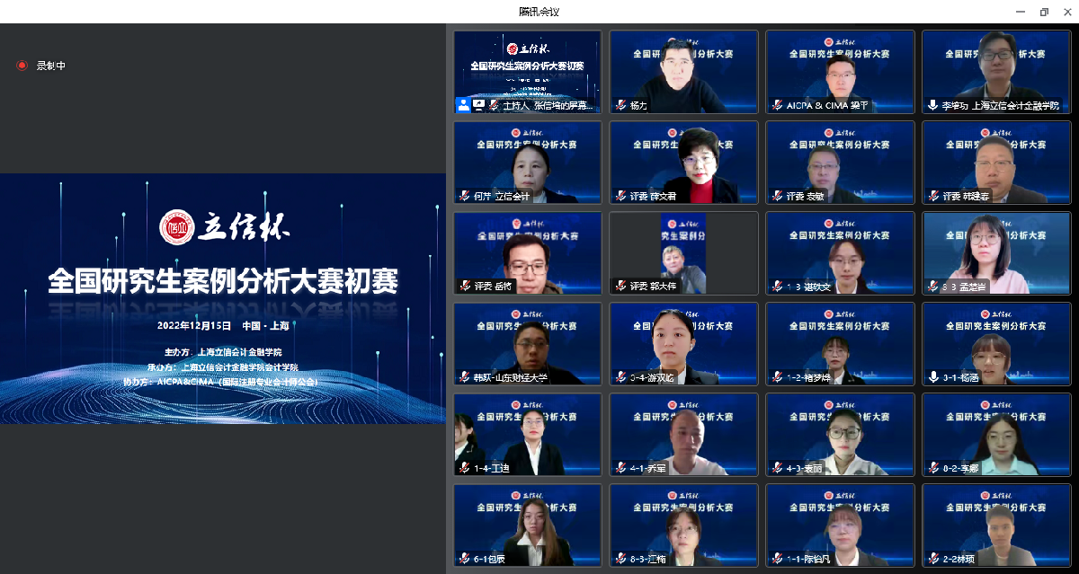 12月15日上午,第二届“立信杯”全国研究生案例分析大赛在线上开幕。大赛由学校主办,会计学院承办,AICPA&CIMA(国际注册专业会计师公会)协办。校党委副书记、院长杨力,AICPA&CIMA中国大陆事务总监梁平出席并致辞。来自全国8所高校的学生参赛。开幕式由会计学院院长李培功主持。