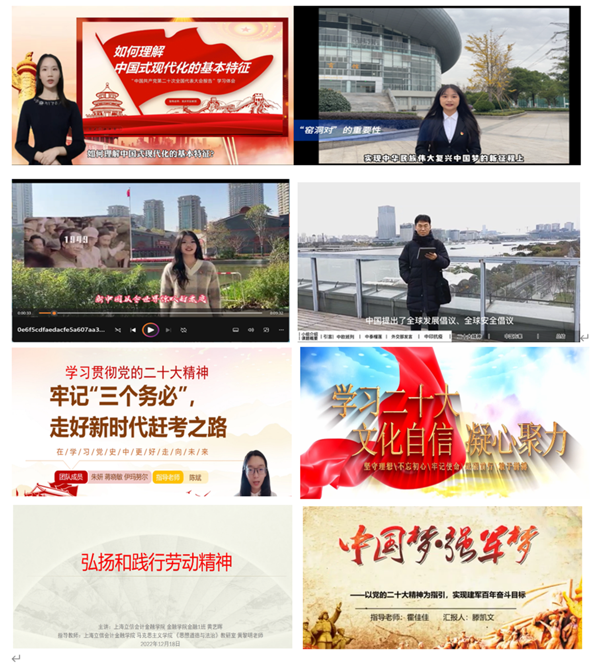 活动启动近两个月以来,思政课教师们和所指导的学生团队密切合作,深入学习“党的二十大精神”,共录制授课视频28个,主题涵盖坚持党的全面领导、中国式现代化、文化自信凝聚人心、弘扬和践行劳动精神、中国梦强军梦、中国共产党的“赶考”精神、知行合一推进碳达峰碳中和等,达到了师生共同学习“党的二十大精神”、深入推进“党的二十大精神”入心入脑的目标,展现了立信学子认真学习二十大、团结一致跟党走、努力建功新时代的良好精神风貌。